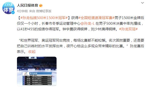 獲得全國短道速滑冠軍賽男子1500米金牌後僅僅一個小時,長春市冬季運動管理中心@孫龍-L 在男子500米決賽中率先撞線,以41秒455的成績奪得冠軍。鍾宇晨獲得銀牌,劉少林摘得銅牌。