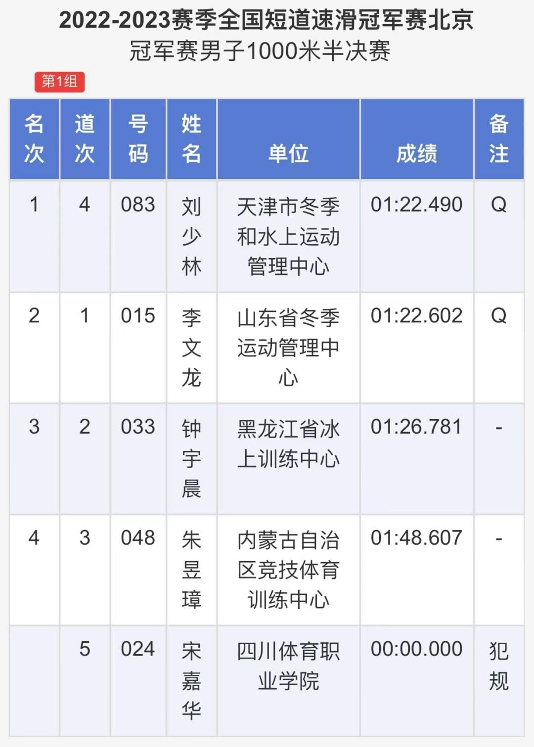 4月2日,2022-2023賽季全國短道速滑冠軍賽在首都體育館繼續進行。在男子1000米半決賽中,代表天津隊出戰的劉少林以1分22秒490的成績率先撞線,不僅獲得小組第一晉級決賽,還打破了該項目全國紀錄。