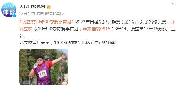 鞏立姣賽後表示,19米30的成績也達到自己的預期。