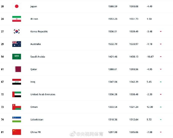 國際足聯公佈了最新一期的男足世界排名,新科世界冠軍阿根廷超越巴西成爲第一,法國升至第二,巴西隊跌至第三位。而在亞足聯方面,日本(世界排名第20)與伊朗(世界排名第24)繼續位居前兩位,國足則從上一期的世界排名第80位下滑一位至世界第81位,繼續排在亞洲第11位。