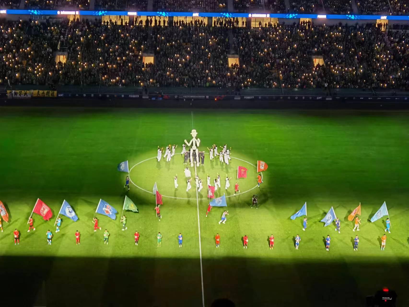 兩支由充氣人偶組成的“巨人球隊”隨着音樂的律動在球場中拉開433的攻守陣型,是揭幕戰的開場秀,更是2023中超聯賽新的開端。