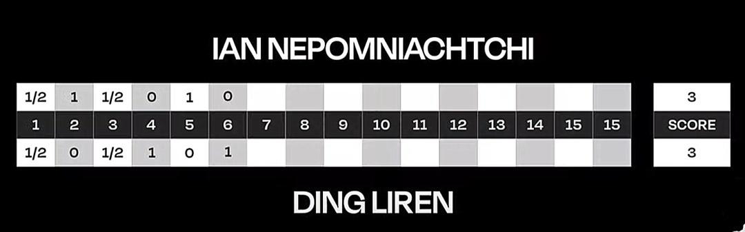 北京時間4月16日晚,2023國際棋聯世界冠軍賽在哈薩克斯坦阿斯塔納繼續進行。第五盤告負的丁立人在第六盤經過44回合的比拼,執白完勝俄羅斯棋手涅波姆尼亞奇,將總比分扳平。目前雙方以3:3齊頭並進。