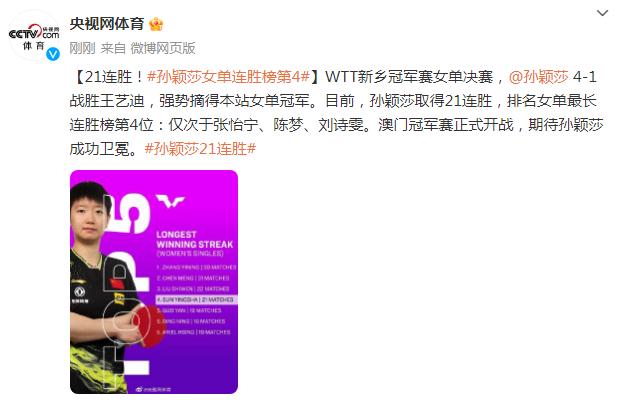 WTT新鄉冠軍賽女單決賽,@孫穎莎 4-1戰勝王藝迪,強勢摘得本站女單冠軍。目前,孫穎莎取得21連勝,排名女單最長連勝榜第4位:僅次於張怡寧、陳夢、劉詩雯。澳門冠軍賽正式開戰,期待孫穎莎成功衛冕。