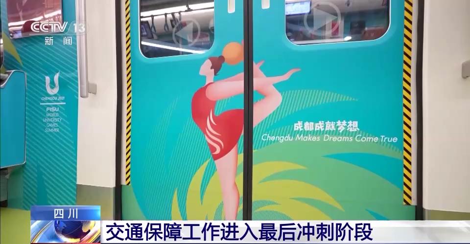 記者:如果選擇地鐵出行,你可能會坐上大運會倒計時100天的主題列車。車內設計以“成都成就夢想”爲主題,將太陽神鳥作爲主要視覺元素。車廂不僅被打造成了一個個移動的運動場,還融入了成都的地標性建築,看上去更像是一座行走的天府文化體驗館。