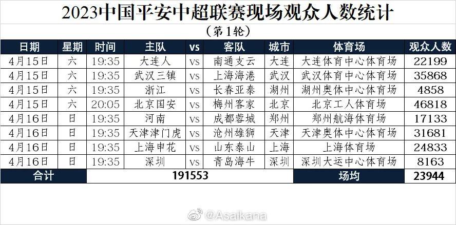 新賽季中超聯賽於4月15日開幕,截至目前已進行兩輪比賽,共有364058名觀衆走進球場觀戰,其中首輪場均23944名觀衆,超過2019年全年現場平均觀衆人數。