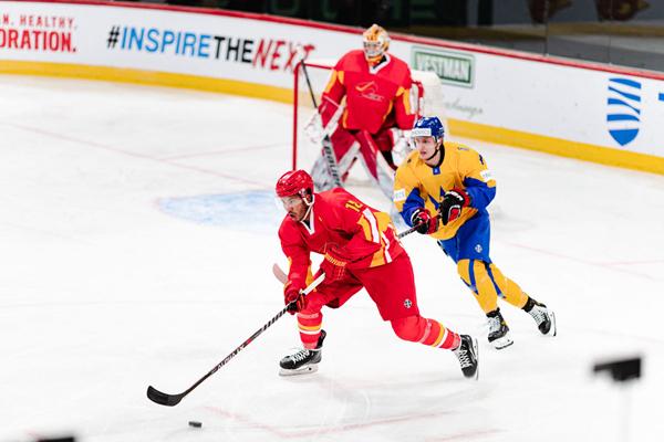 中國隊球員葉勁光(前)在比賽中。圖片來源:國際冰球聯合會