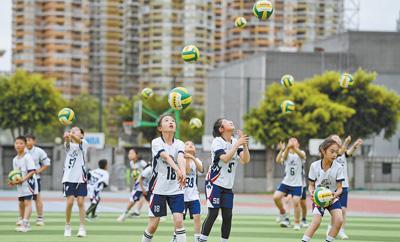 4月23日,在四川省成都市高新區菁蓉小學,小學生在操場上練習排球。