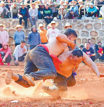 紅河哈尼族彝族自治州彌勒市西三鎮正在舉行彝族傳統摔跤比賽活動。