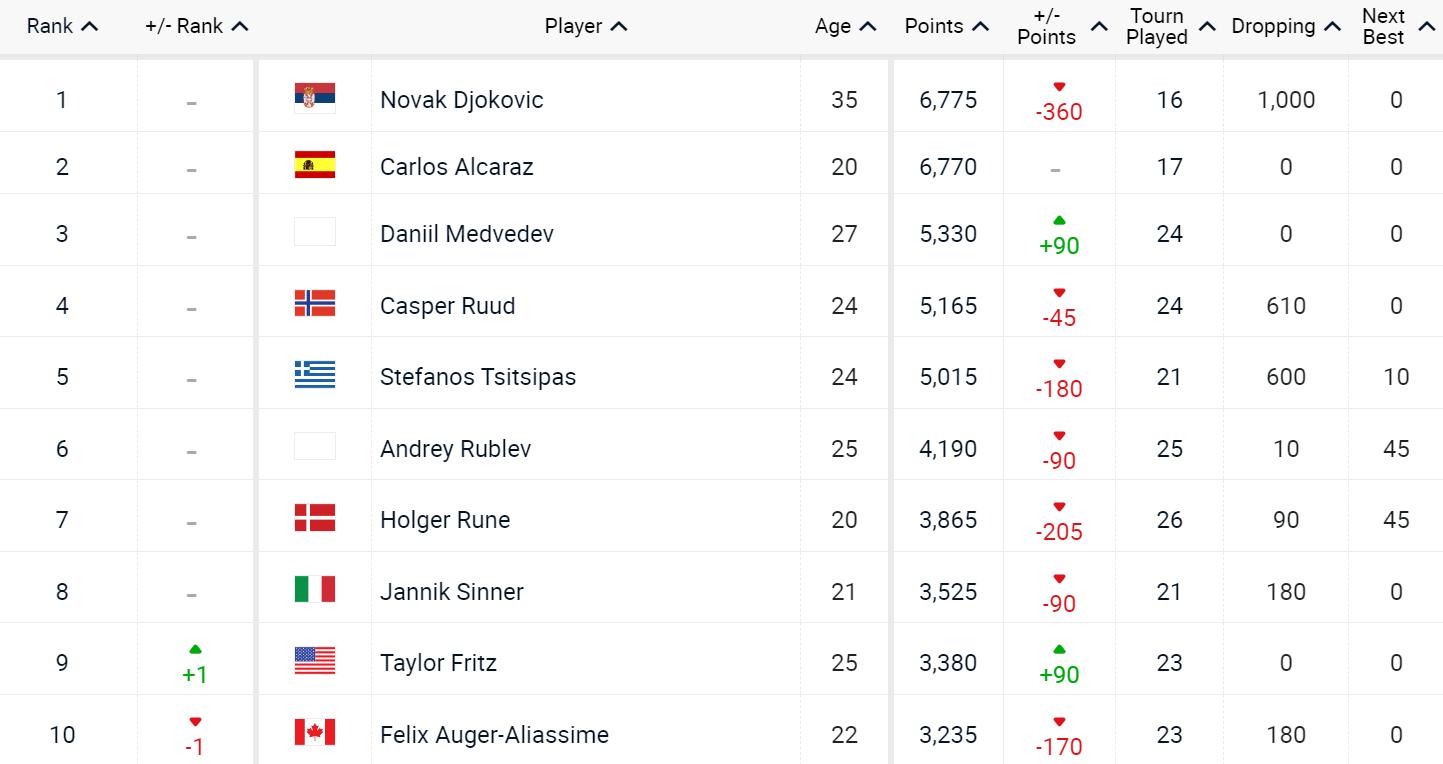 值得注意的是,排名榜首的德約科維奇僅領先位居次席的阿爾卡拉斯5分。由於德約科維奇在接下來的羅馬大師賽中有1000分的衛冕冠軍積分,因此只要阿爾卡拉斯能在羅馬大師賽第二輪登場參賽,就能確保至少收穫10個積分,從而在羅馬大師賽結束後重回世界第一,並以頭號種子的身份出戰法網。