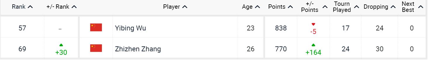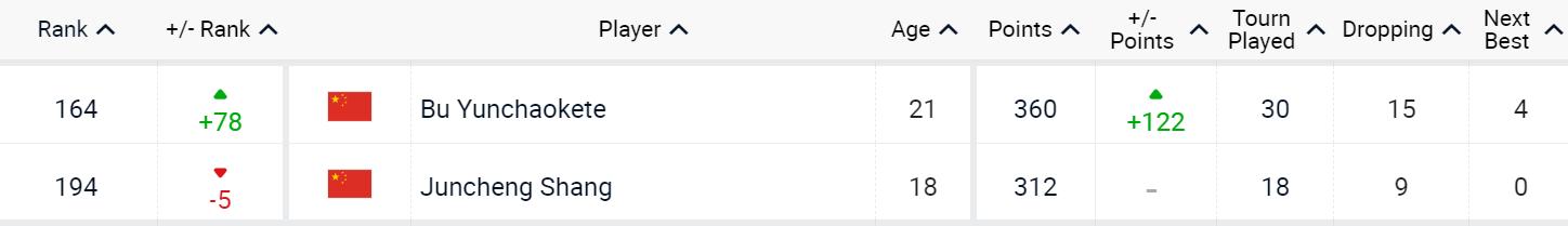 中國選手中,吳易昺繼續排名第57位。憑藉着上週在馬德里大師賽中闖入八強的出色表現,張之臻排名飆升30名,來到第69位,創造個人最佳。近來在挑戰賽中表現搶眼的布雲朝克特同樣刷新個人最佳,他提升78位,目前排名第164名。商竣程下降5位,排名第194名。