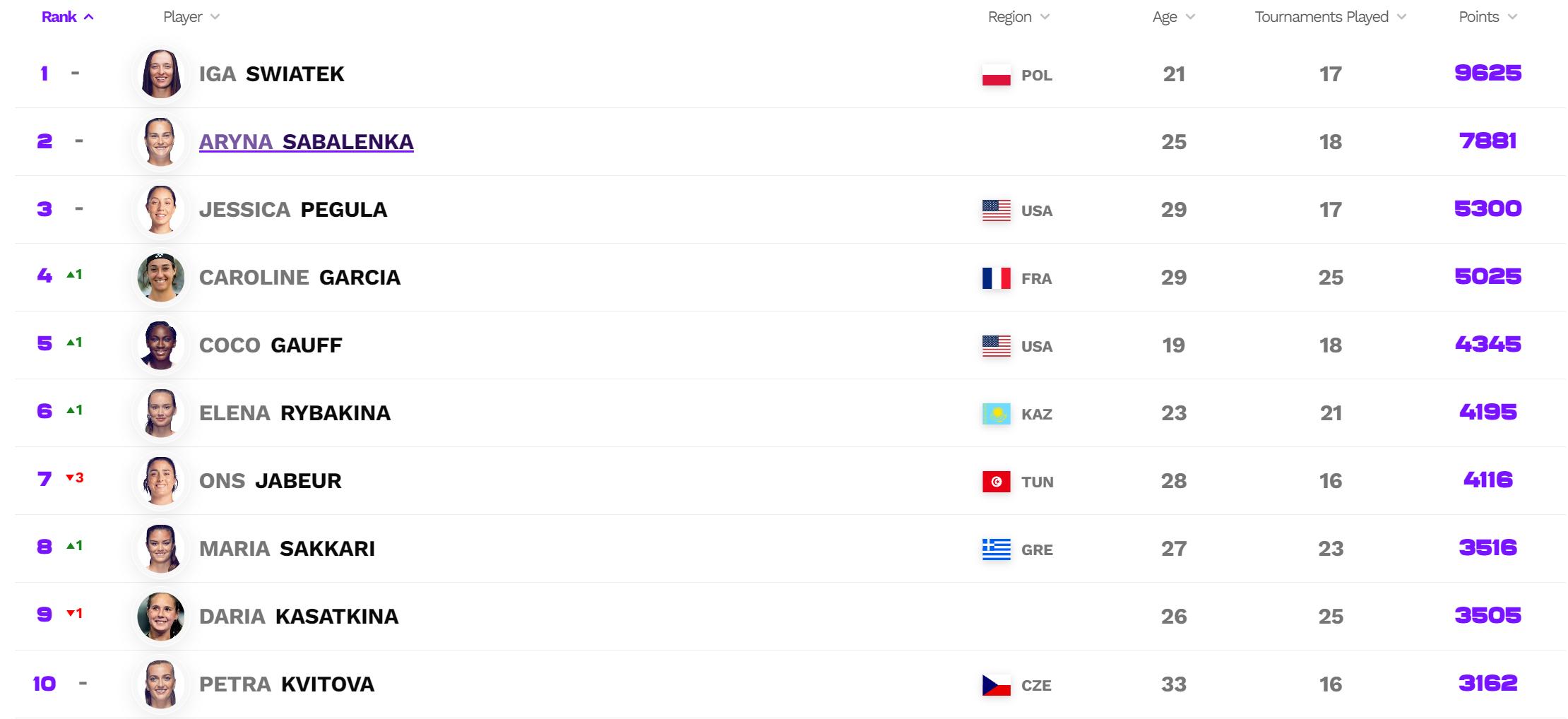 此外,斯瓦泰克、薩巴倫卡、佩古拉繼續高居前三,加西亞、高芙、萊巴金娜各上升一位,分列四到六名,賈巴爾下滑三位名列第七。