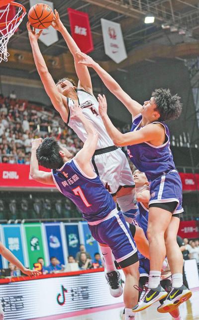 5月14日,北京首鋼籃球中心,回浦中學隊球員淡厚然(左二)在決賽中完成補籃。
