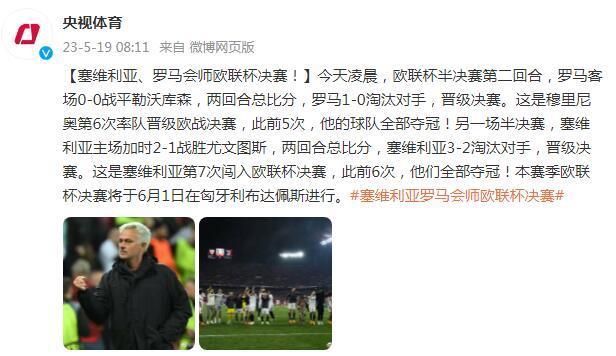 今天凌晨,歐聯杯半決賽第二回合,羅馬客場0-0戰平勒沃庫森,兩回合總比分,羅馬1-0淘汰對手,晉級決賽。這是穆里尼奧第6次率隊晉級歐戰決賽,此前5次,他的球隊全部奪冠!另一場半決賽,塞維利亞主場加時2-1戰勝尤文圖斯,兩回合總比分,塞維利亞3-2淘汰對手,晉級決賽。這是塞維利亞第7次闖入歐聯杯決賽,此前6次,他們全部奪冠!本賽季歐聯杯決賽將於6月1日在匈牙利布達佩斯進行。