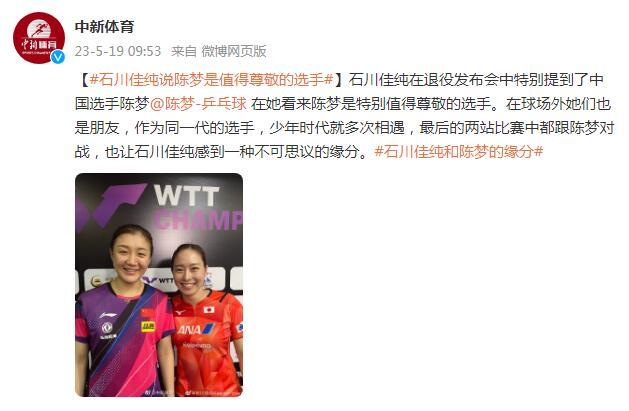 石川佳純在退役發佈會中特別提到了中國選手陳夢@陳夢-乒乓球 在她看來陳夢是特別值得尊敬的選手。在球場外她們也是朋友,作爲同一代的選手,少年時代就多次相遇,最後的兩站比賽中都跟陳夢對戰,也讓石川佳純感到一種不可思議的緣分。