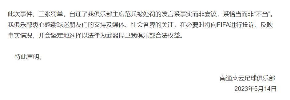 最後南通支雲俱樂部表示,“在必要時將向FIFA進行投訴,並會堅定地選擇以法律爲武器捍衛我俱樂部合法權益”。