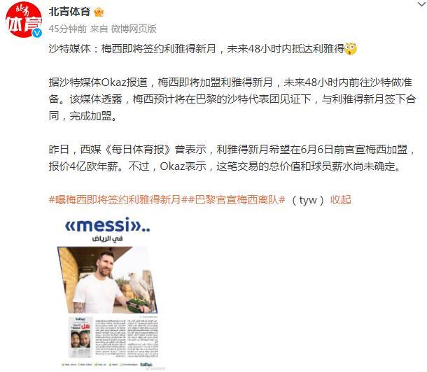 昨日,西媒《每日體育報》曾表示,利雅得新月希望在6月6日前官宣梅西加盟,報價4億歐年薪。不過,Okaz表示,這筆交易的總價值和球員薪水尚未確定。