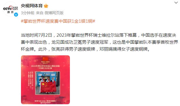 當地時間7月2日,2023年攀巖世界盃瑞士維拉爾站落下帷幕,中國選手在速度決賽中表現出色,龍見國成功衛冕男子速度冠軍,這也是中國攀巖隊本賽季首枚世界盃金牌。此外,張亮獲得男子速度銀牌,鄧麗娟摘得女子速度銅牌。