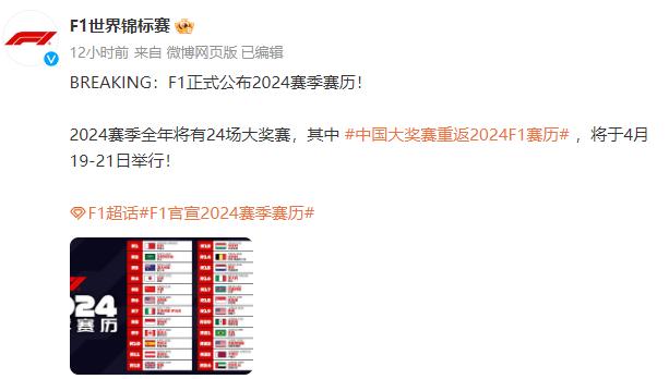 F1今日正式公佈2024賽季賽歷。全年將有24場大獎賽,其中中國大獎賽重返2024F1賽歷,將於4月19至21日舉行。