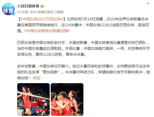 北京時間7月14日凌晨,2023年世界女排聯賽總決賽在美國阿靈頓繼續進行,在1/4決賽中,中國女排以3比1戰勝巴西女排,挺進四強。