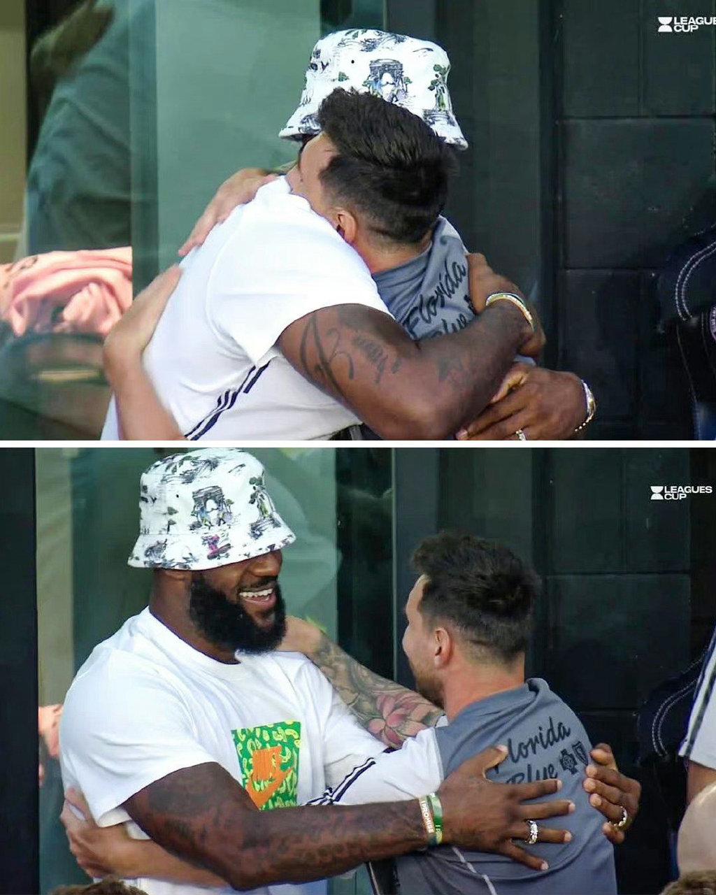 賽前,NBA巨星詹姆斯就來到現場,送給了梅西一個大大的擁抱。