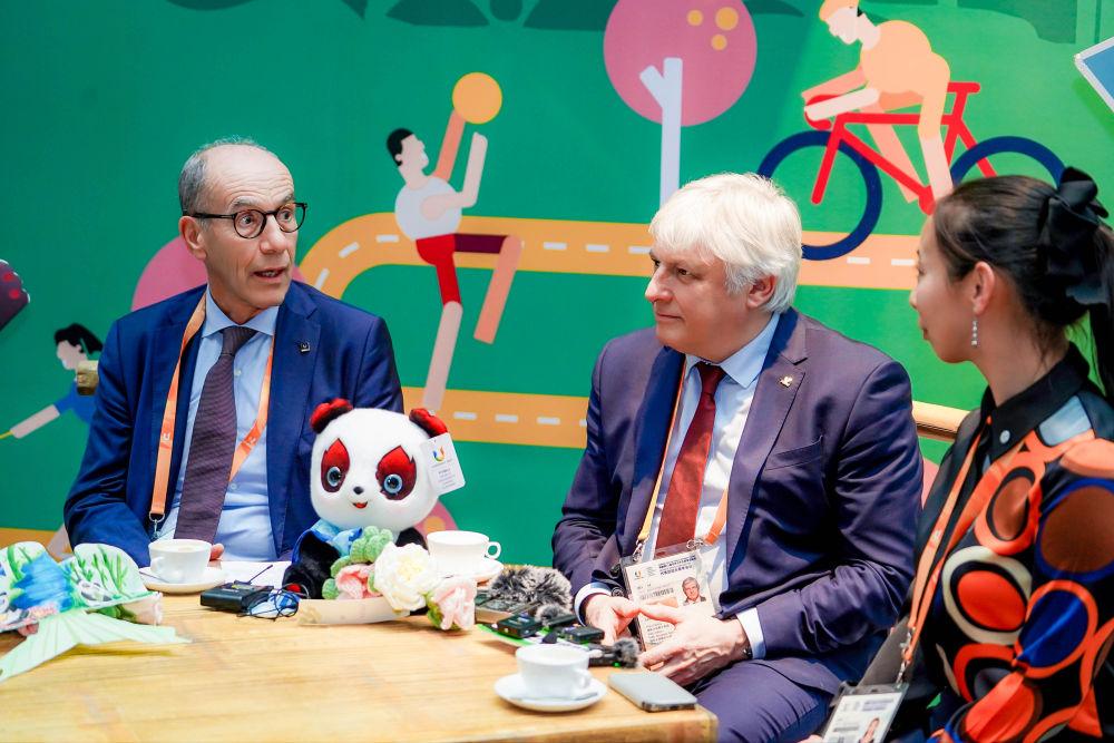 國際大體聯代理主席雷諾·艾德(左)在第31屆世界大學生夏季運動會代表團團長春季會議上參與交流。新華社發(成都大運會執委會供圖)