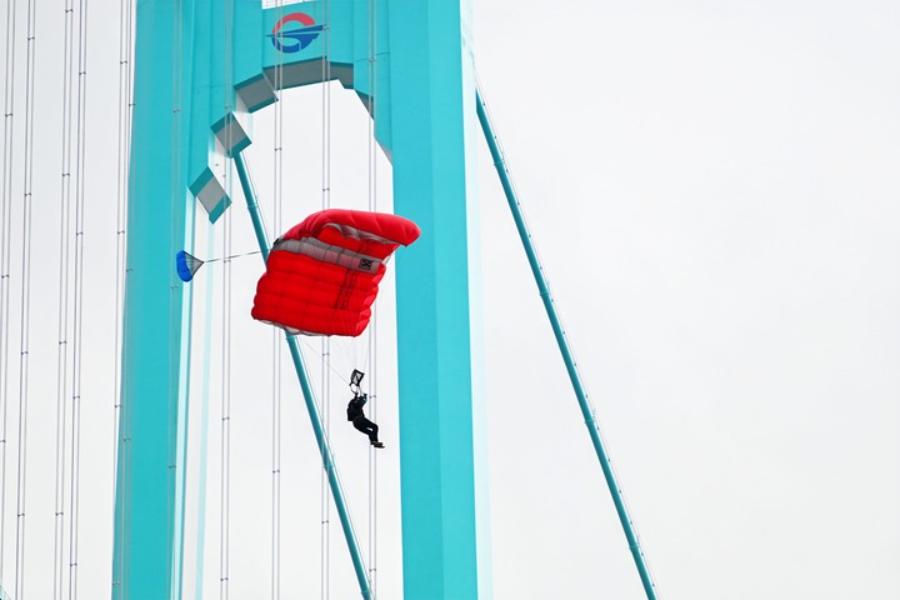 雖爲團隊最年輕的參賽選手,馬索尼仍迫切迎接挑戰。28日下午,他身着翼裝,完成標準起跳動作後滑翔數秒,繼而完成優雅的空中迴轉,眺望身後的巍峨大橋與壯美喀斯特地貌。在他看來,這是橋面無法企及的觀景視角。隨後他復位俯姿繼續飛行,最終打開降落傘,安穩降落在江面浮艇上。“中國山水爲我們這類探險者提供了無限可能,我期待能再來中國。”馬索尼說。