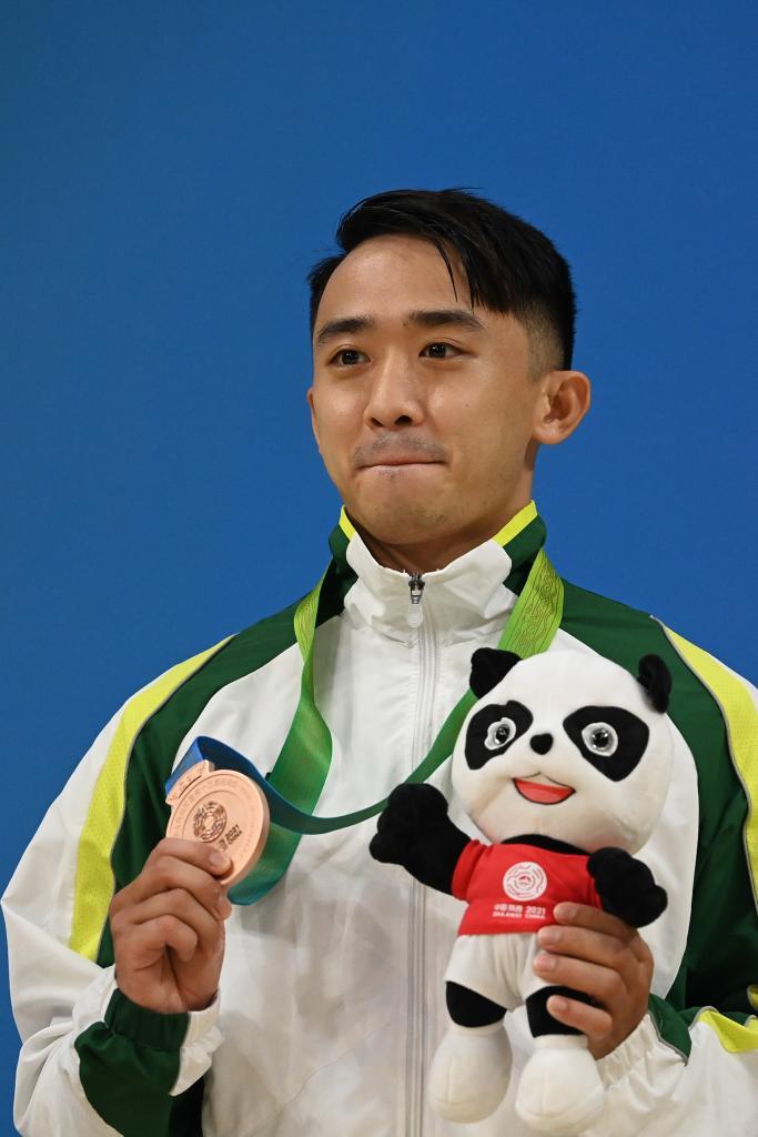 2021年9月18日,澳門隊選手郭建恆在頒獎儀式上。當日,在西安舉行的第十四屆全運會空手道比賽男子個人型比賽中,澳門隊選手郭建恆以25.02分獲得銅牌。新華社記者 顏麟蘊 攝