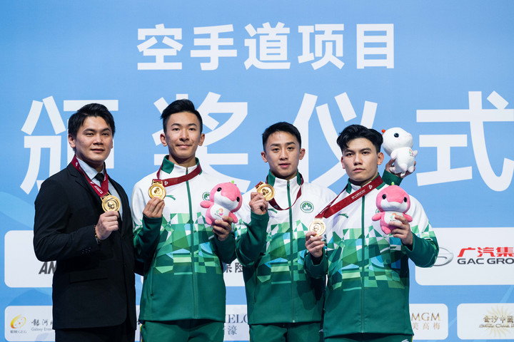 新華社澳門11月6日電(記者齊菲、郭雨祺)第十五屆全運會空手道項目6日在澳門綜藝館打響。由郭建恆、方文浩和鄭沘珞組成的澳門隊在決賽中擊敗香港隊,奪得男子業餘組團體型冠軍。這是本屆全運會空手道項目的首金,也是澳門隊首次在全運會羣衆賽事中奪金。