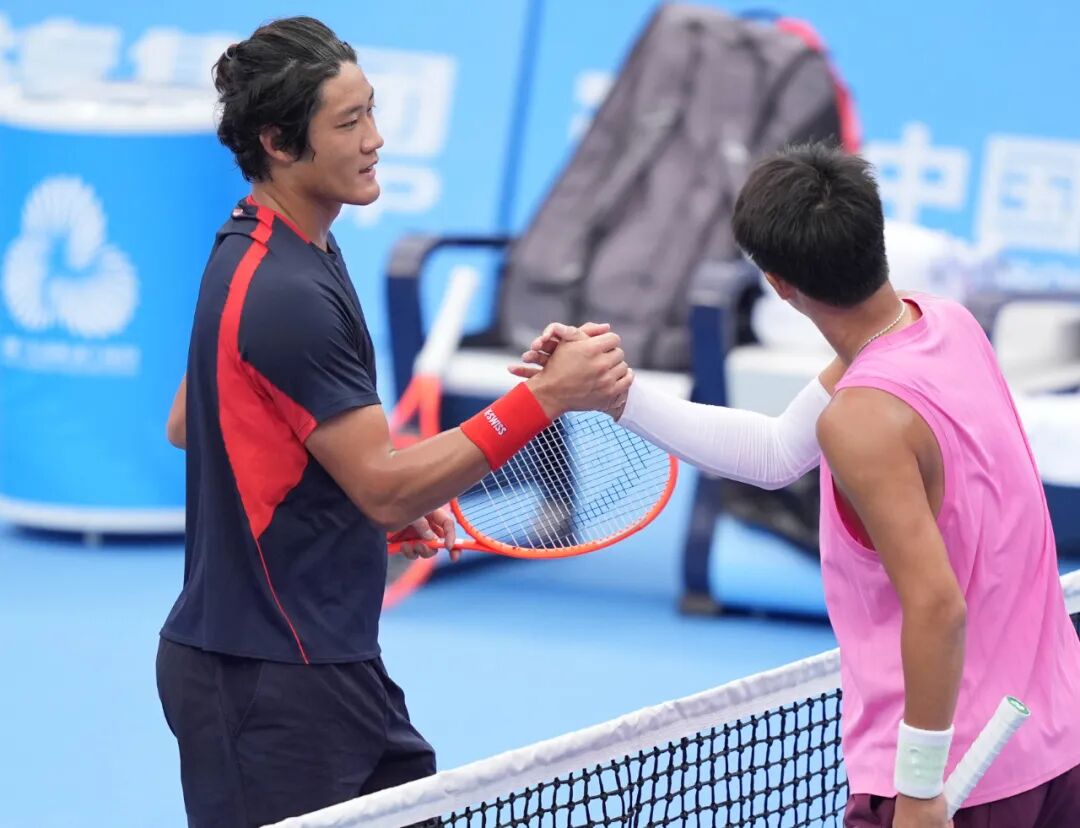 11月13日,第十五屆全國運動會網球項目男子單打第一輪在珠海橫琴舉行。上海隊選手張之臻(左)與湖南隊選手周洺舟在賽後握手致意。