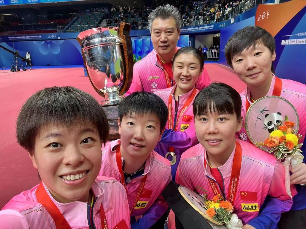 獲得冠軍後,參加此次世乒賽的五位國乒女將和李隼緊緊擁抱在一起。“今天當國歌奏響、國旗升起的時候,我就想起了去年東京奧運會的一幕,這一刻(感到)特別自豪和驕傲,真的很美好。”孫穎莎說。