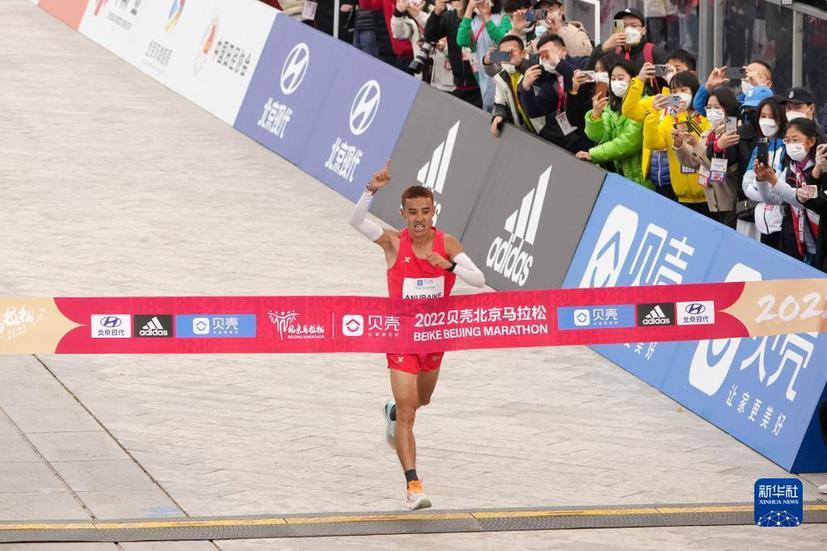 11月6日,阿奴拜克·庫彎在比賽中衝線。他以2小時14分34秒的成績獲得男子組第一名。當日,2022北京馬拉松賽在北京舉行。新華社記者 鞠煥宗 攝