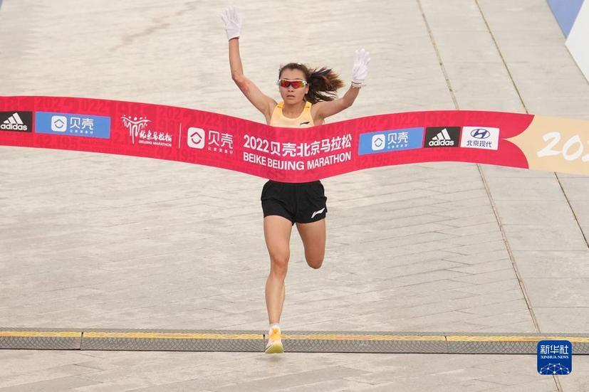 11月6日,夏雨雨在比賽中衝線。她以2小時28分57秒的成績獲得女子組第一名。當日,2022北京馬拉松賽在北京舉行。新華社記者 鞠煥宗 攝