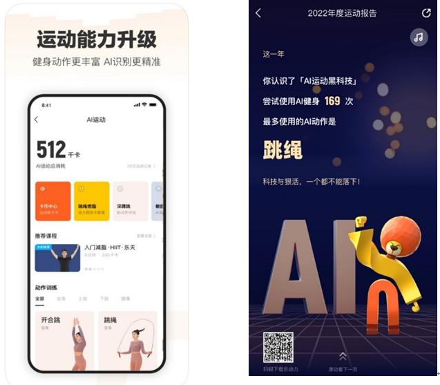 數據顯示,樂動力全平臺用戶全年平均參與運動天數超過110天,人均消耗24054卡路里,人均參與走路/跑步運動里程超過300公里。線上參與運動也在過去一年成爲了樂動力用戶熱捧的居家生活方式。2022年,樂動力用戶參與“AI運動”人數明顯增多,較前一年增長224%,最受歡迎的AI運動項目是跳繩。