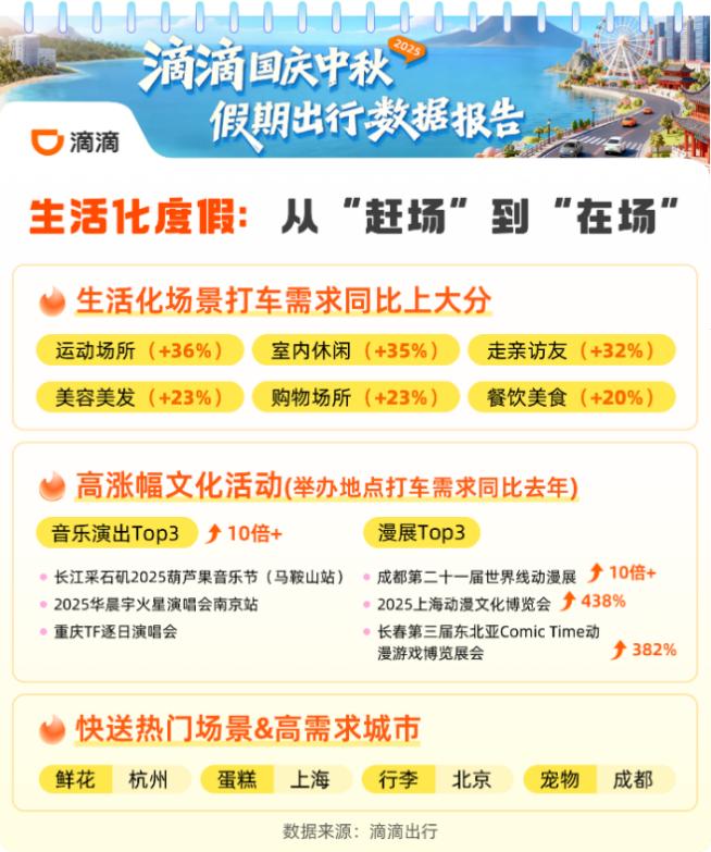 今年“十一”黃金週,生活化度假正在重構“附近”消費動線。與去年同期相比,前往運動場所和室內休閒場所的打車需求分別上漲36%和35%,美容美髮、購物和餐飲美食場所的需求上漲均超過20%。雙節氛圍疊加,假期走親訪友需求同比上漲32%。