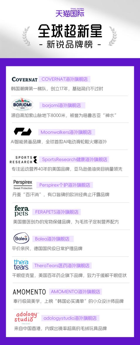 聚焦細分、個性化消費需求的海外品牌在天貓站穩腳跟,帶動更多新品牌來中國市場拓展生意。10月10日,天貓國際的發佈2025三季度全球超新星品牌榜顯示,韓國本土第一代街頭潮牌COVERNAT、在高加索山脈地下8000米取水的格魯吉亞國寶級礦泉水品牌BORJOMI、全球首款AI輪式外骨骼設備品牌Moonwalkers都來天貓開首店。據瞭解,這份榜單基於旗艦店生意規模、品牌影響力、消費者喜愛度三個維度,每季度選出成長迅速的進口新銳“尖子生”。