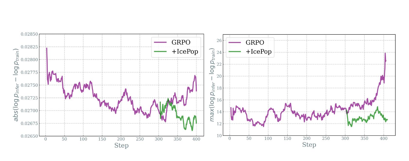 萬億參數思考模型訓練最大難題是訓推精度差異,即訓練階段與推理階段因實現細節差異導致的訓練和推理精度不一致,進而導致訓練崩潰。在Ring-1T模型中,螞蟻採用了自研的“棒冰(icepop)”算法來應對這項行業難題,即用帶掩碼的雙向截斷技術把訓練-推理分佈差異凍結在低水位,確保長序列、長週期訓練不崩。此外,應對萬億參數模型強化學習訓練,螞蟻還自研了高性能強化學習系統ASystem(其中包含已開源的高性能強化學習框架AReaL),特別針對萬億參數模型的顯存管理和訓推權重交換問題做了精細的優化,實現了單機顯存碎片秒級回收、權重零冗餘交換,把大規模RL訓練穩定跑成日常。