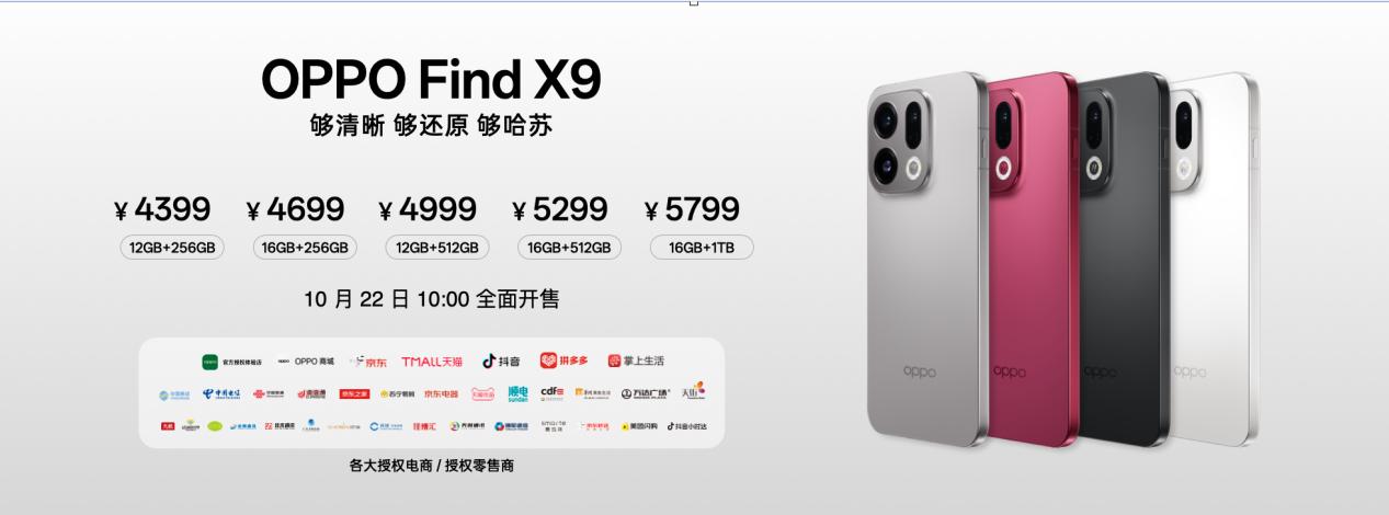 作爲 OPPO 30 週年鉅獻之作,Find X9 系列以畫質革命徹底重構影像體驗,用全面進化的性能、續航、護眼好屏與更流暢更智慧的系統,精準解決用戶核心痛點,強勢打造新一代旅拍神器。Find X9 系列 4399 元起售,10 月 22 日正式開售;Find X9 Pro 衛星通信版 11 月開售,並將率先支持 eSIM。OPPO與哈蘇聯合打造的哈蘇專業影像套裝售價 1699 元。