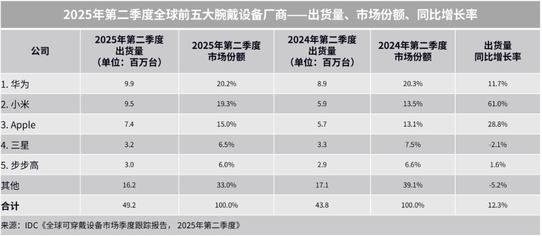 IDC最新發布的2025年第二季度全球腕戴設備市場報告顯示,在整體市場12.3%的同比增長態勢中,華爲以990萬臺出貨量、20.2%的市場份額蟬聯全球榜首,出貨量同比增幅達11.7%,在頭部廠商中展現出極強的市場韌性,而其在中國市場連續6年出貨量第一的成績,更印證了品牌紮根本土的深厚積澱。