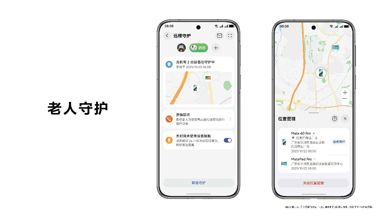 而對於老年羣體,系統的守護功能更顯貼心:長時間未使用設備的提醒功能,能及時關注長輩的安全狀態;新增的守護圍欄與到達目的地通知功能,可讓子女實時掌握長輩的出行動態,有效預防老人走失。這些功能的設計,沒有采用生硬的監控模式,而是以尊重爲前提,在保障安全的同時,維護了長輩的自主空間,讓科技守護更有溫度。