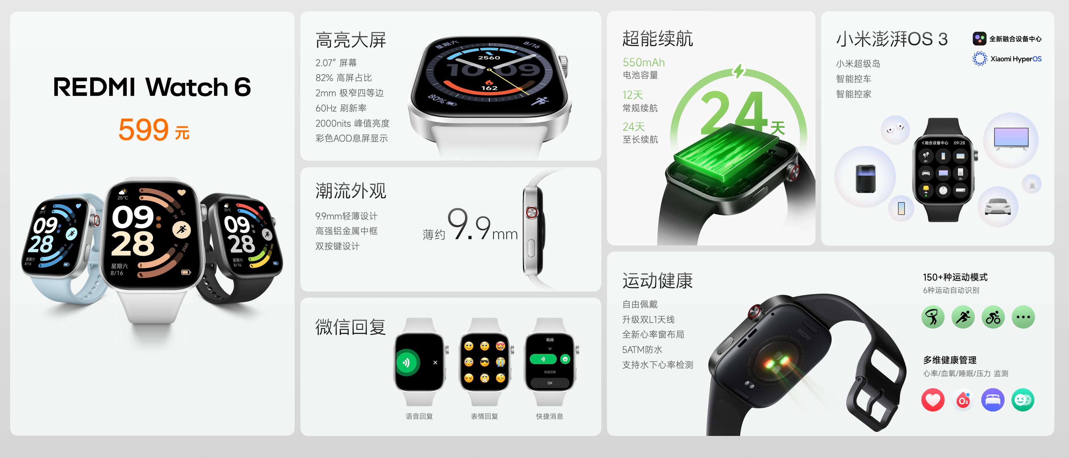 功能上,REDMI Watch 6搭載小米澎湃OS 3,支持表端控車(含SU7/YU7等NFC車鑰匙)、米家互聯與小米超級島,可收發微信消息並支持文字、語音、表情回覆;健康監測涵蓋心率、血氧、睡眠、壓力、女性健康管理,內置呼吸訓練功能;運動方面支持150+種運動模式,含6種運動自動識別,具備5ATM防水、GNSS獨立定位與雙L1天線導航。續航上,該手錶內置550mAh電池,常規使用續航12天,最長可達24天,提供典雅黑、皎月銀、迷霧藍三款配色,搭配200餘款潮流錶盤及懸浮人像錶盤,售價599元,發佈會後正式開售。