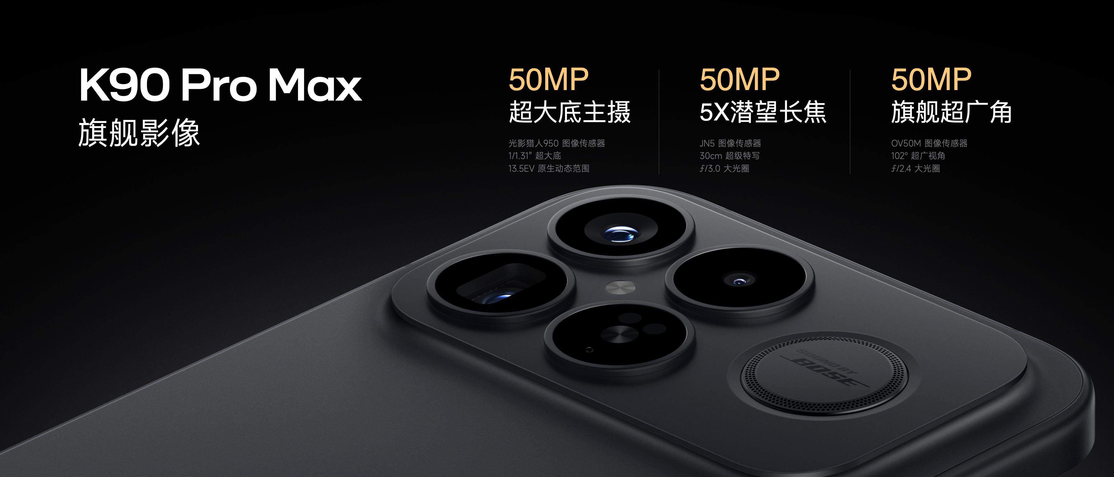 REDMI K90 Pro Max搭載全焦段影像系統,主攝爲5000萬像素“光影獵人950”傳感器,尺寸1/1.31英寸,具備13.5EV超高動態範圍,搭配1G+6P鏡頭,通過逐片鍍膜減少畫面發霧、鬼影、眩光。該機型首次加入5000萬像素5倍光學潛望長焦鏡頭,支持10倍無損變焦與20倍以上AI超級變焦,拓展創作場景。
