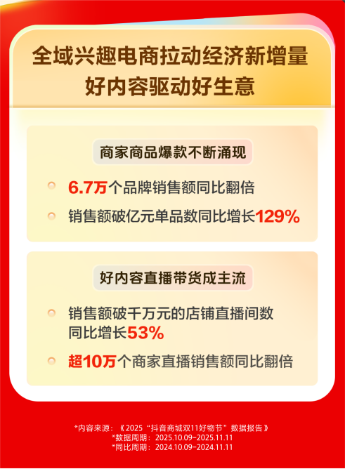 11月12日,《2025“抖音商城雙11好物節”數據報告》(以下簡稱“報告”)發佈。報告顯示,10月9日至11月11日,全域興趣電商模式有效拉動實體經濟新增量,平臺上有6.7萬個品牌銷售額同比翻倍,超過10萬商家直播銷售額同比翻倍。此外,中小達人成爲助推增長的中堅力量,在整體達人帶貨中貢獻超八成銷售額。