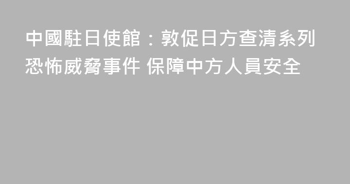 新華社東京4月16日電(記者陳澤安)中國駐日本大使館16日強烈敦促日方加快查清系列恐怖威脅案情,保障中國駐日使領館館舍和人員安全。中國駐日本大使館當天下午就近期受到系列恐怖威脅舉行記者會。使館說,3月5日,自稱由前警察和前自衛隊員組成的日方人員向中國駐日本大使館寄送恐嚇信。使館收到恐嚇信......