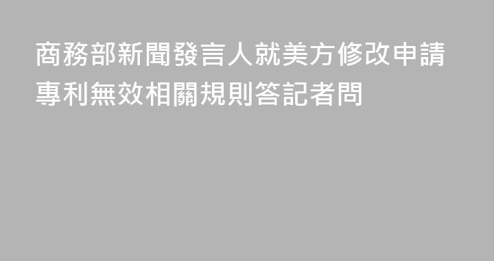 有記者問:美國商務部專利商標局近期發佈備忘錄,修改專利無效申請的透明度規則,重點審查有外國背景企業提出的申請。據悉,個別中國企業已收到美方通知,要求其陳述適用專利無效申請的理由。請問商務部對此有何評價?答:中方注意到,美方近期以“國家安全”爲名修改申請專利無效相關規則。中方認爲美方做法違......