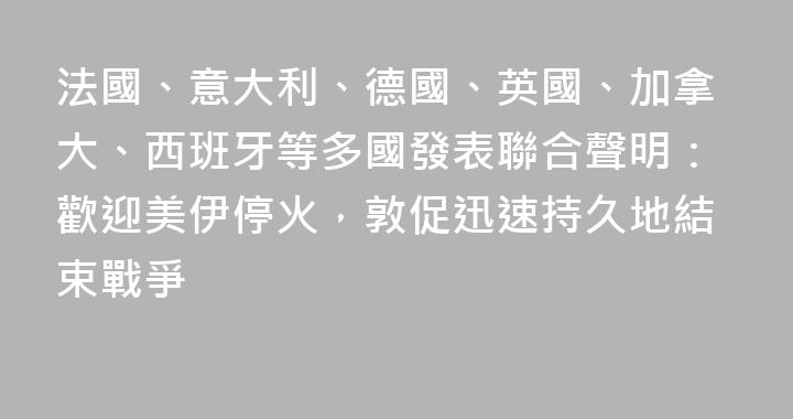 綜合法新社、路透社報道,法國、意大利、德國、英國、加拿大、丹麥、荷蘭、西班牙以及歐盟領導人當地時間8日發表聯合聲明,對美伊達成爲期兩週的停火協議表示歡迎,並敦促雙方通過外交途徑“迅速而持久”地結束這場戰爭。這些國家領導人在聯合聲明中稱:“當前的目標必須是在未來幾天內通過談判迅速且持久地結......