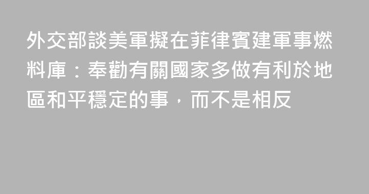 外交部發言人郭嘉昆主持4月14日例行記者會。有記者提問稱,據報道,美軍計劃在菲律賓達沃地區新建軍事燃料庫,有評論認爲,美方此舉旨在強化在西太平洋的燃料補給和後勤保障能力,是美“印太”防務戰略、鞏固“第一島鏈”作戰體系的重要一環,可能係爲潛在衝突做準備。請問中方對此有何評論?郭嘉昆表示,當......