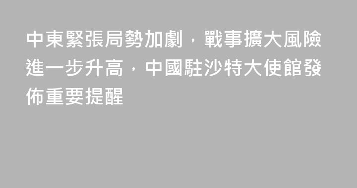 當前,中東緊張局勢加劇,戰事擴大風險進一步升高,有關方宣稱本地區石油、電力等基礎設施可能成爲重要打擊目標。中國駐沙特大使館再次提醒在沙中國公民密切關注安全形勢和沙有關部門發佈的相關公告和警報,遵守當地法律法規,切實增強安全防範意識,減少外出。遠離敏感區域,不隨意拍攝,不在社交媒體傳播相關......