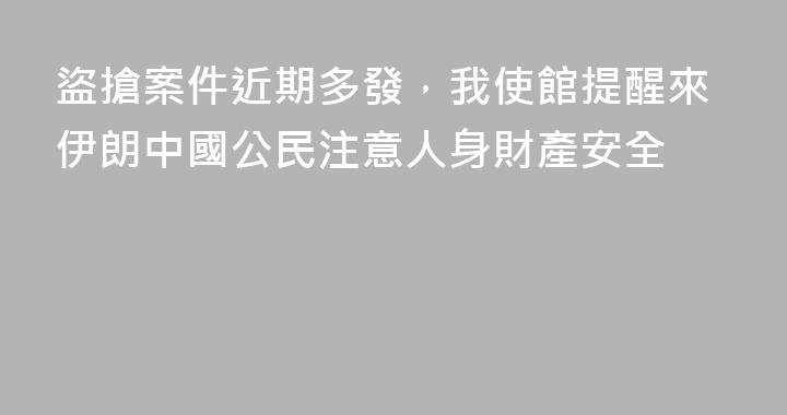 近期,我館接報多起來伊旅遊、參展的中國公民遭遇盜搶案件,包括被迷暈後遭搶、在大型展會上被盜、被僞裝成警察人員盜竊財物等情形。此外,還有中國公民來伊出差期間飲酒死亡。鑑於上述,駐伊朗使館提醒中國公民注意以下事項:一、妥善保管財物。增強自我安全防範意識,保管好個人財物和身份證件,留存護照、簽......