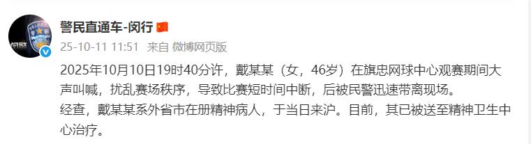 2025年10月10日19時40分許,戴某某(女,46歲)在旗忠網球中心觀賽期間大聲叫喊,擾亂賽場秩序,導致比賽短時間中斷,後被民警迅速帶離現場。經查,戴某某系外省市在冊精神病人,於當日來滬。目前,其已被送至精神衛生中心治療。......