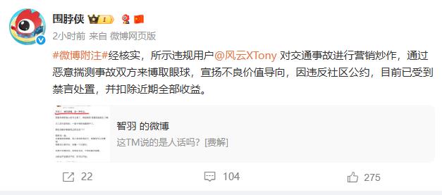 10月9日,微博社區觀察員官方賬號@圍脖俠發佈消息稱,用戶@風雲XTony對交通事故進行營銷炒作,通過惡意揣測事故雙方來博取眼球,宣揚不良价值導向,違反社區公約,目前已受到禁言處置,並扣除近期全部收益。10月6日,@風雲XTony發文稱:“早說了,被陳震撞,是一種幸運。陳震車禍受害人賬號註......